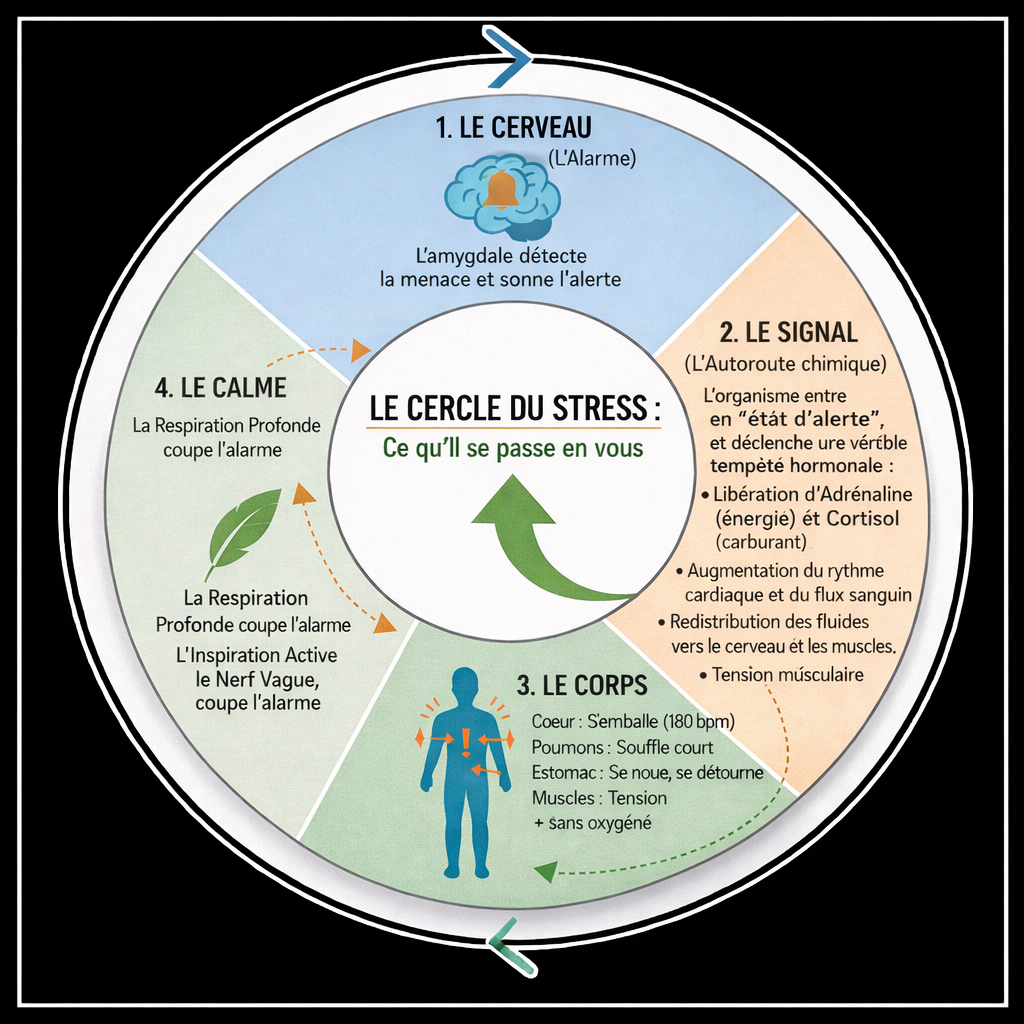 👉 Plus nous analysons nos réactions physiques (cœur qui bat, respiration rapide), plus nous alimentons l'inquiétude.
